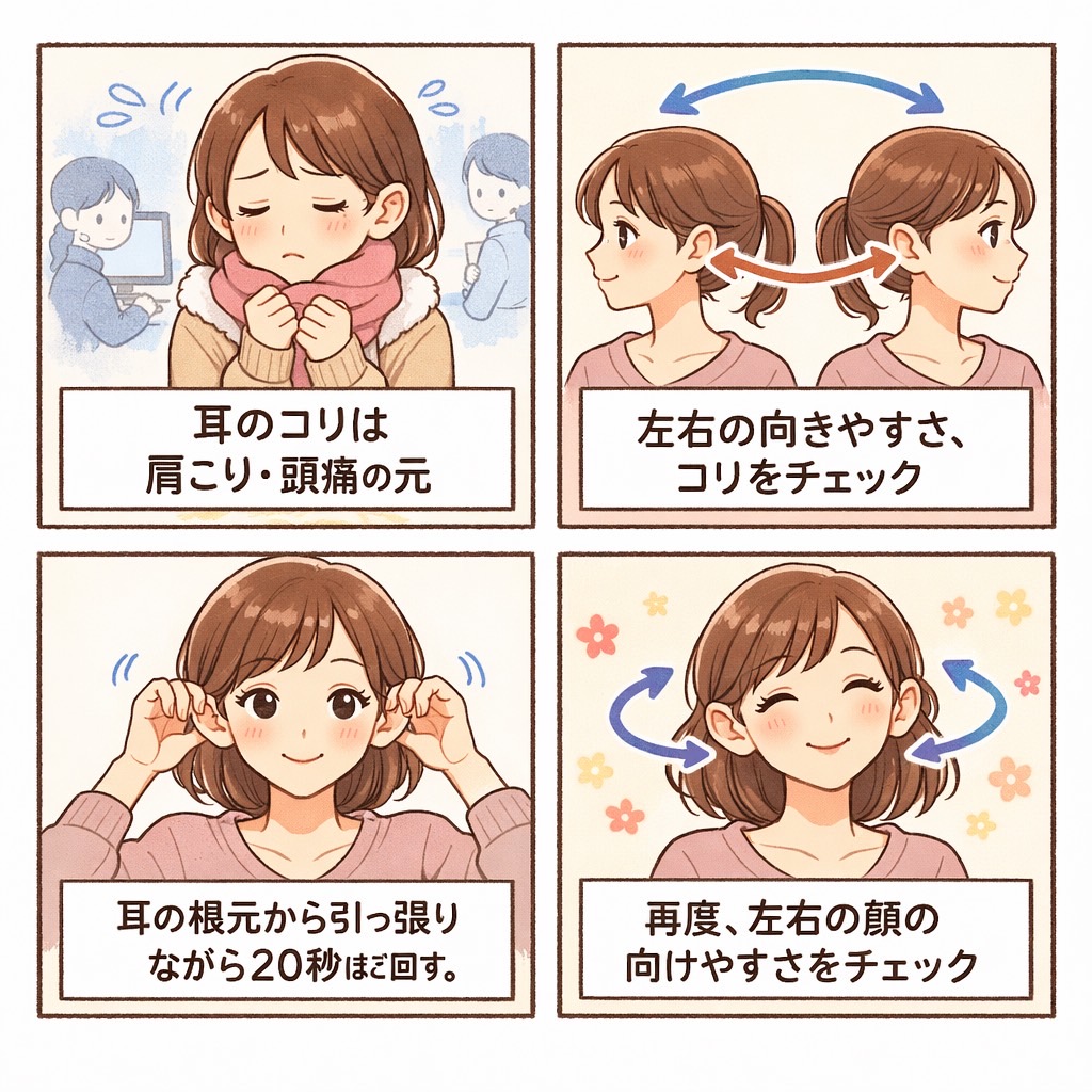 正確には、耳そのものを伸ばすというより、耳の周りをほぐすことで、つながっている**「噛むための筋肉」「目を凝らす筋肉」「首を支える筋肉」**をまとめてリラックスさせてあげるのが目的です。